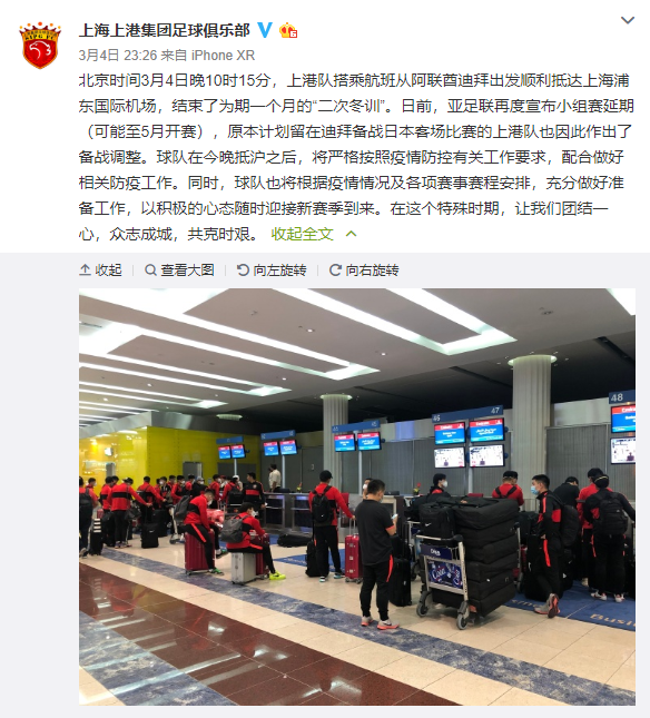 而即使到了中国,按照规定,境外人员也要接受至少14天的隔离。像上港的外教团队上周飞抵上海后,目前仍在隔离当中,球队暂由副总经理孙祥和领队悉志康带训,训练内容以体能和力量为主,同时等待胡尔克等外援尽快归队。而申花崔康熙教练组和外援金信煜索性集训结束后不回韩国,随队一同从阿布扎比经北京转机飞回上海。